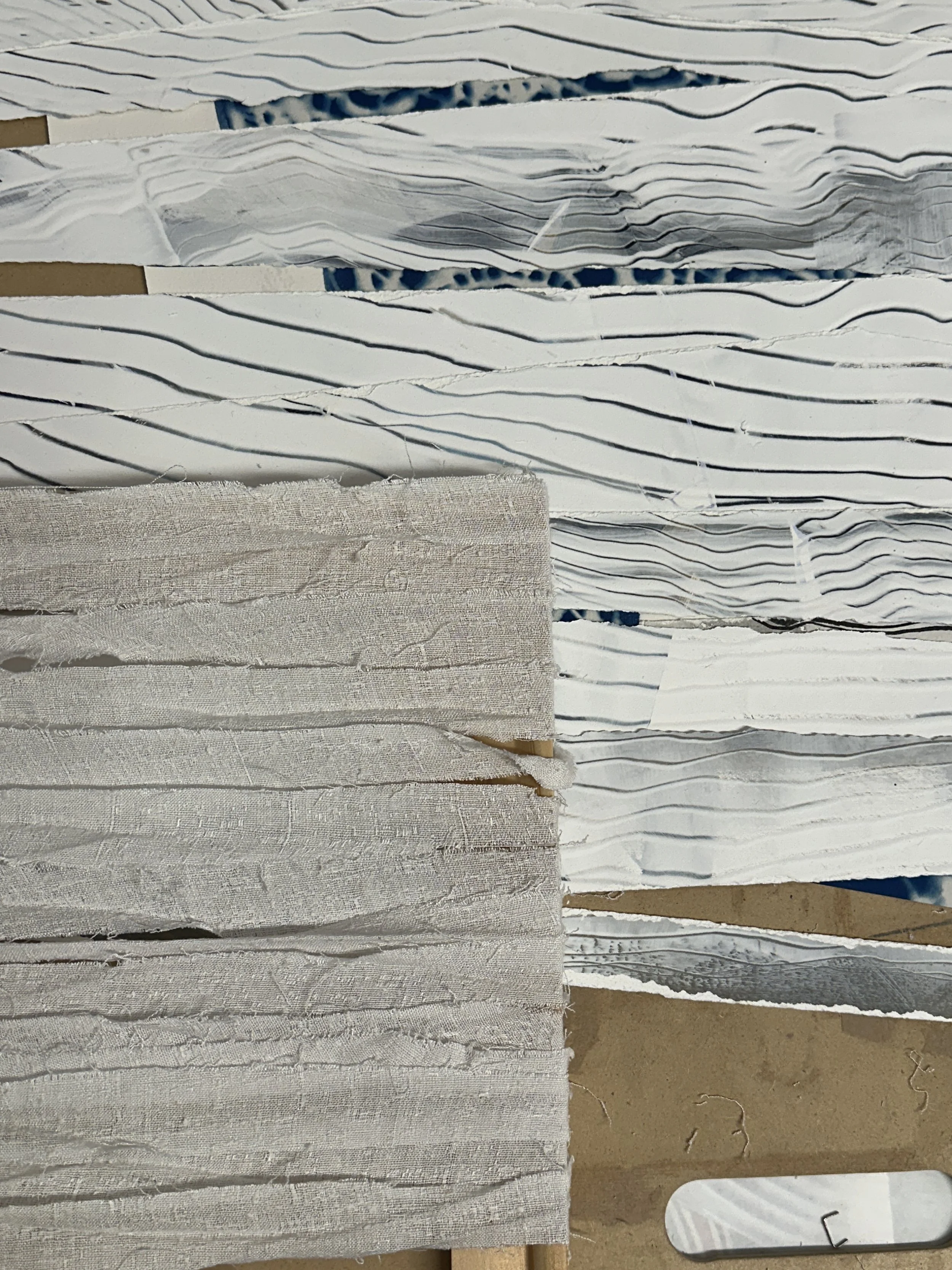 Fabric is a recurring motif and metaphor in my practice. It is a silent witness to our most intimate moments—grieving, resting, lusting, dreaming. It clings to us, holds us, remembers us. In recent work, I cut up older works on paper and weave them back together— not fixing what’s broken, but an act of restitching that mimics the way memory is continuously bent, folded, and reinterpreted. These fragments become mosaics of what is remembered, what is lost, and what we find again through the quiet labor of repair.